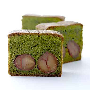 フランス産マロンクリームが入った宇治抹茶パウンド生地を型に流し、渋皮栗をすき間なく詰めました。