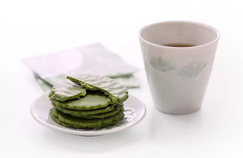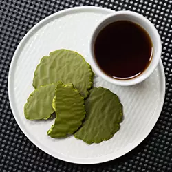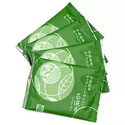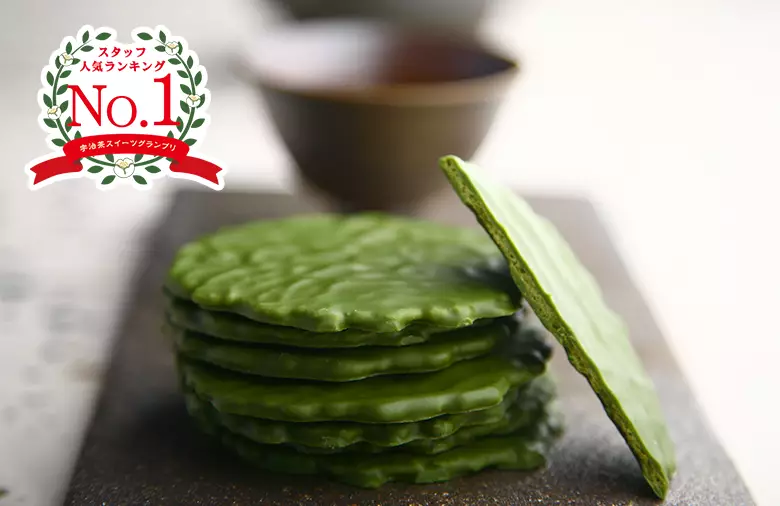 茶房で人気の宇治抹茶パフェでも使われているのが、当店定番人気の宇治抹茶せんべい「うす葉みどり」。抹茶の香りとパリっとした食感が特長の抹茶せんべいを抹茶チョコレートでコーティングしたのが、この「茶遊月」です。
