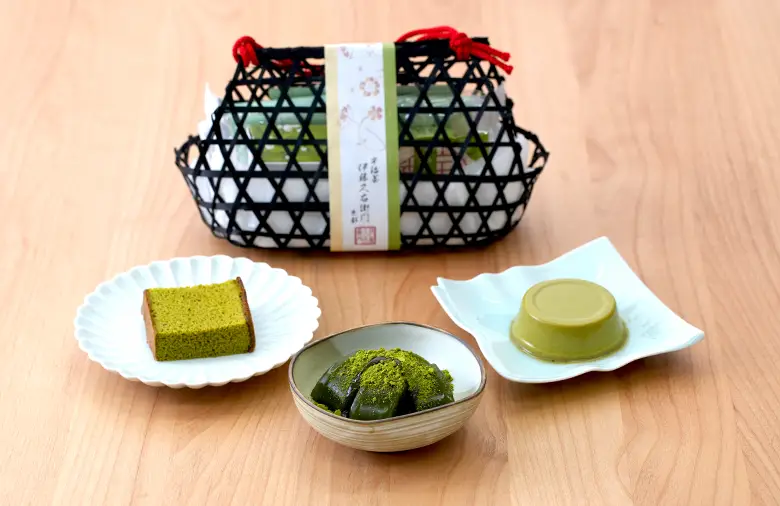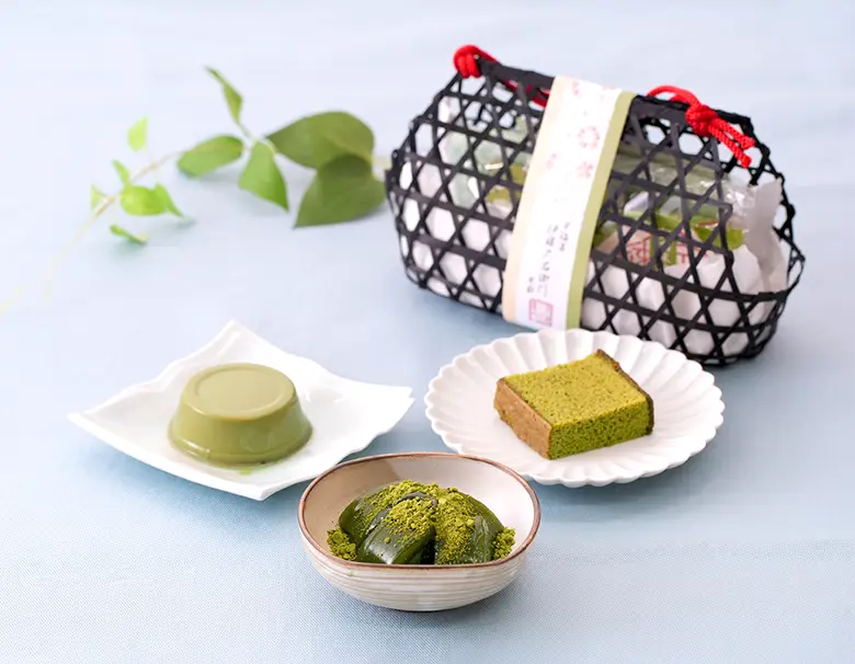 人気の宇治抹茶カステラ、抹茶尽くしの本格わらび餅「茶蕨」、なめらか宇治抹茶プリンと、サッパリとした味と渋味が楽しめる煎茶を可愛い竹かごに詰め合せました。