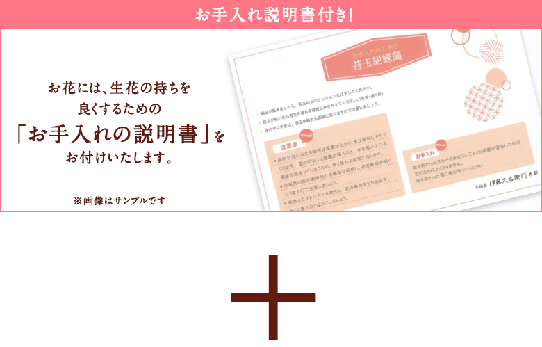胡蝶蘭と聞けば豪華な鉢植えをイメージしますが、肩ひじ張らない贈り物にお薦めなのが、こちらのマイクロ胡蝶蘭。指先でつまめる小ぶりな蘭が苔玉からのびる、独創的なフォルムです。胡蝶蘭の花言葉は「幸福を運んでくる」。大切なお母様に感謝を伝える、母の日の贈り物にぴったりなひと品です。苔玉胡蝶蘭に「抹茶わらび餅1個、抹茶ぷりん1個」をセットにしてお届けします。