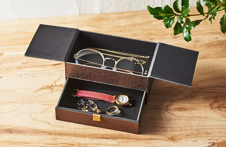 上段は、眼鏡がぴったり入るサイズ。ピアスやリングなども。アクセサリーケースにぴったりです。