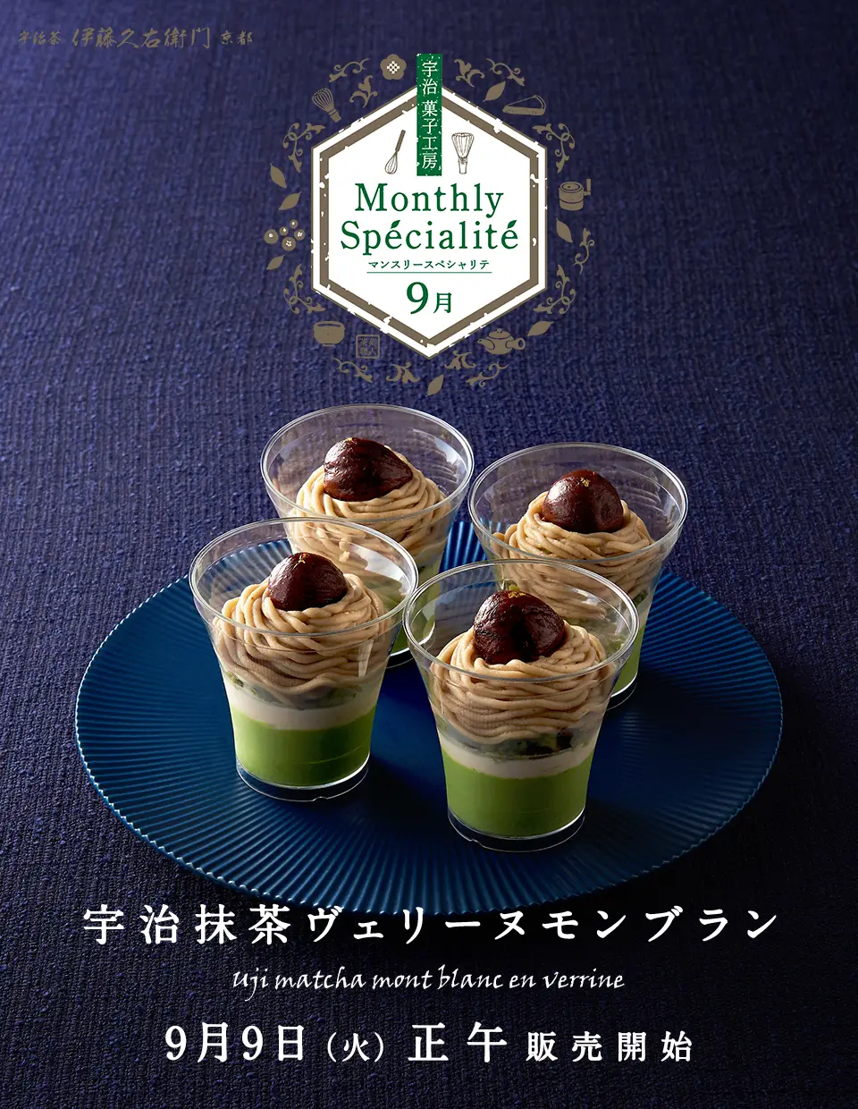 宇治菓子工房がお届けする特別な月替りスイーツ「Monthly Specialite マンスリースペシャリテ」。9月は「宇治抹茶ヴェリーヌ モンブラン」を数量限定でお届けします。