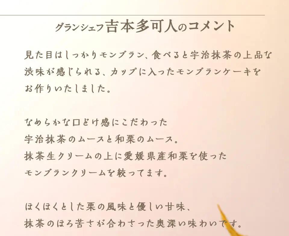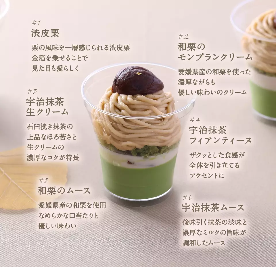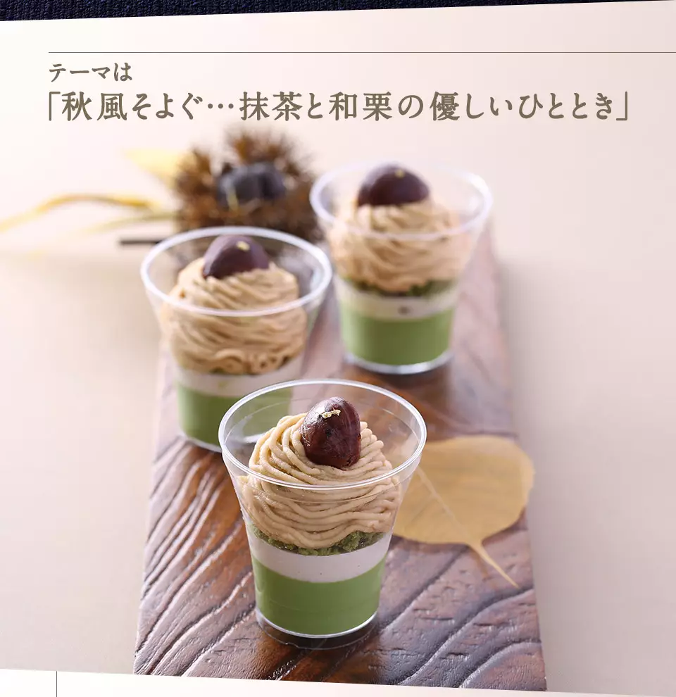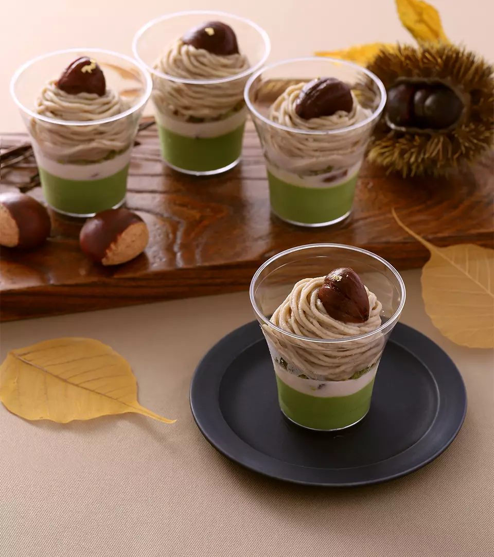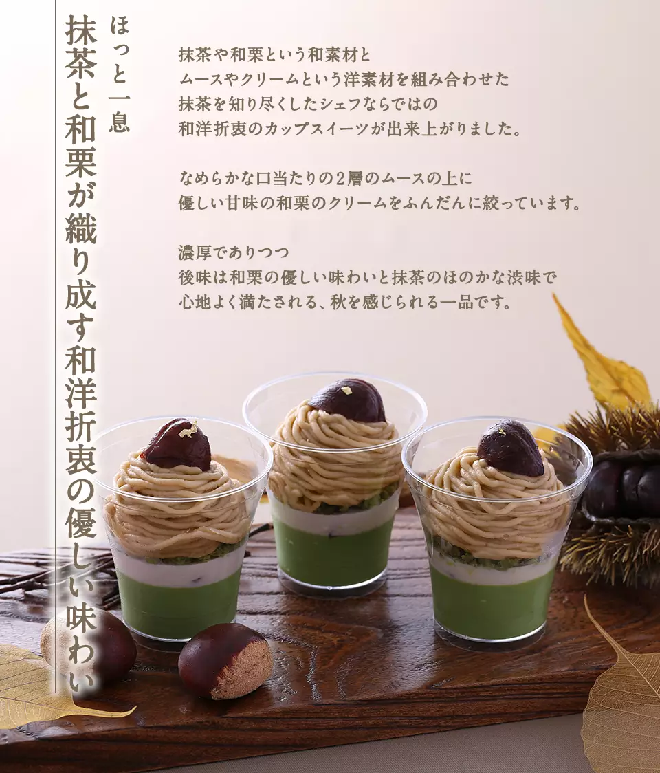 抹茶や和栗という和素材と、ムースやクリームという洋素材を組み合わせた、抹茶を知り尽くしたシェフならではの和洋折衷のカップスイーツが出来上がりました。