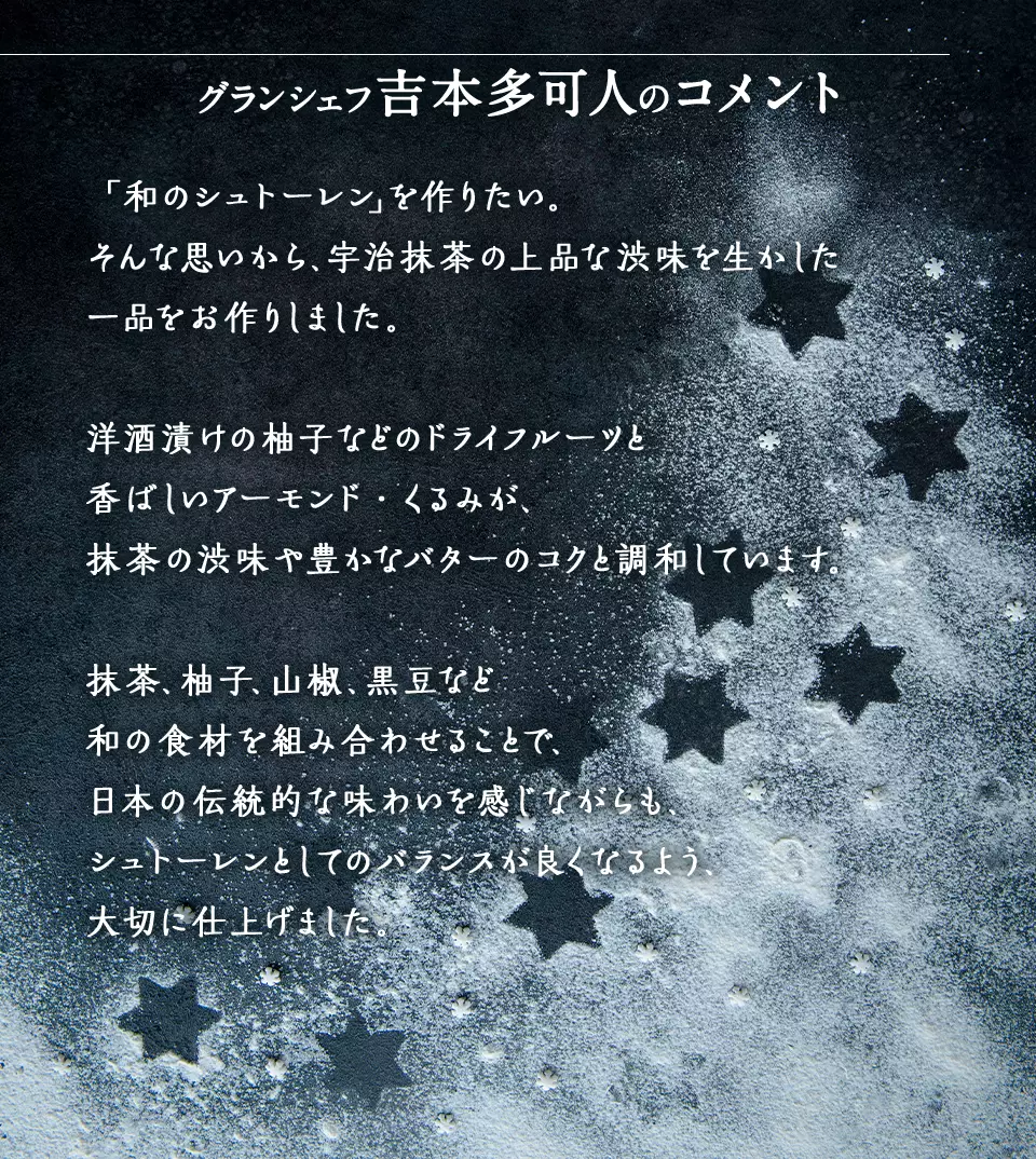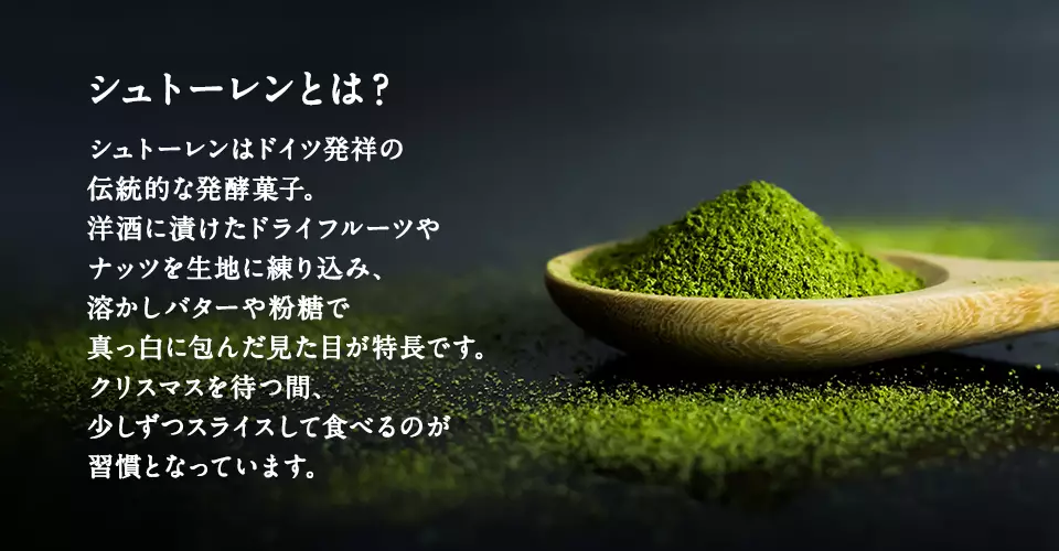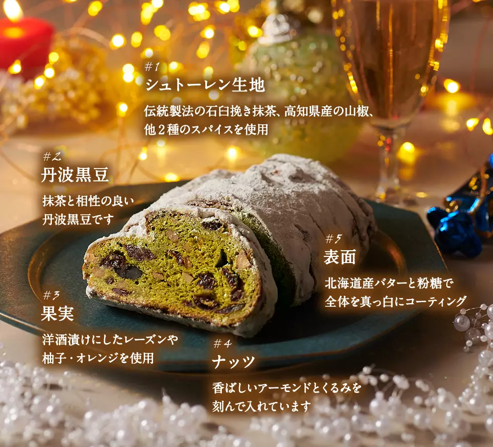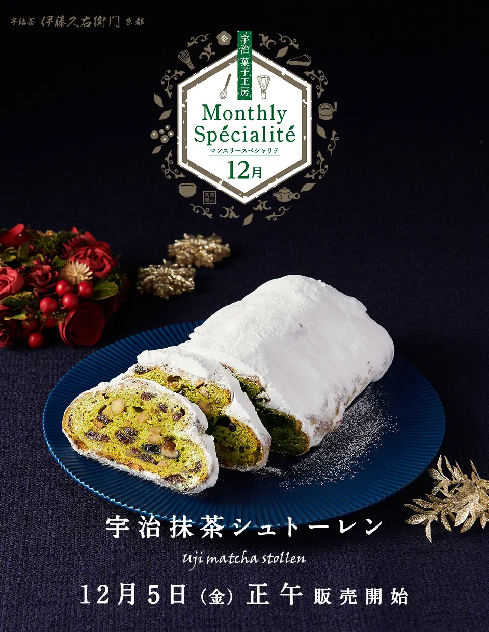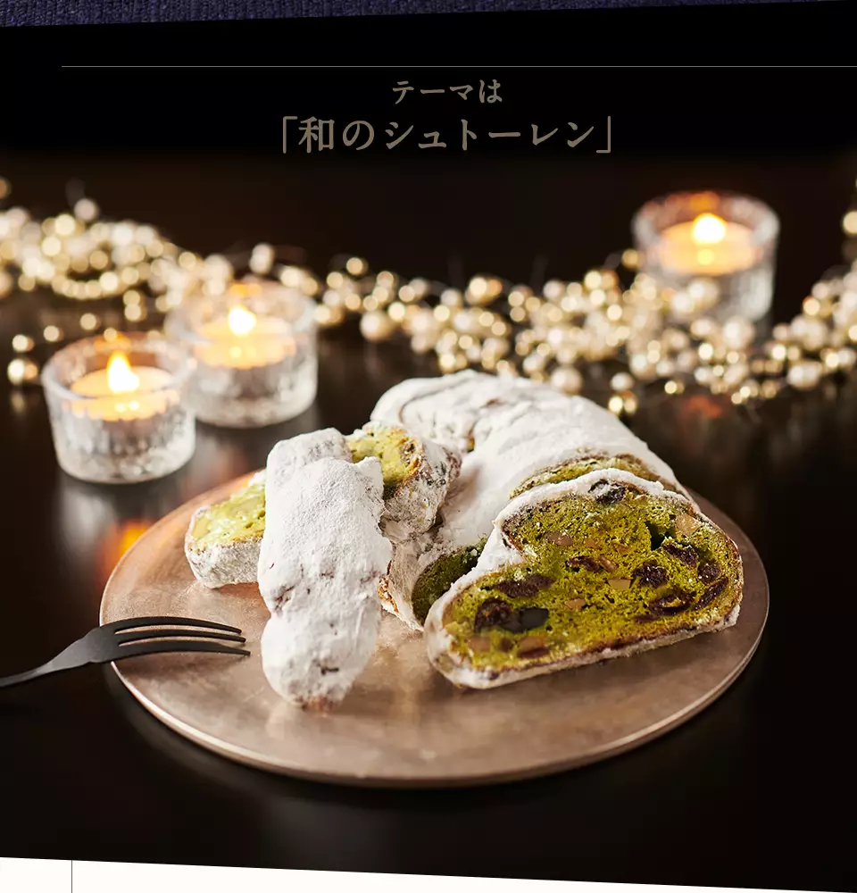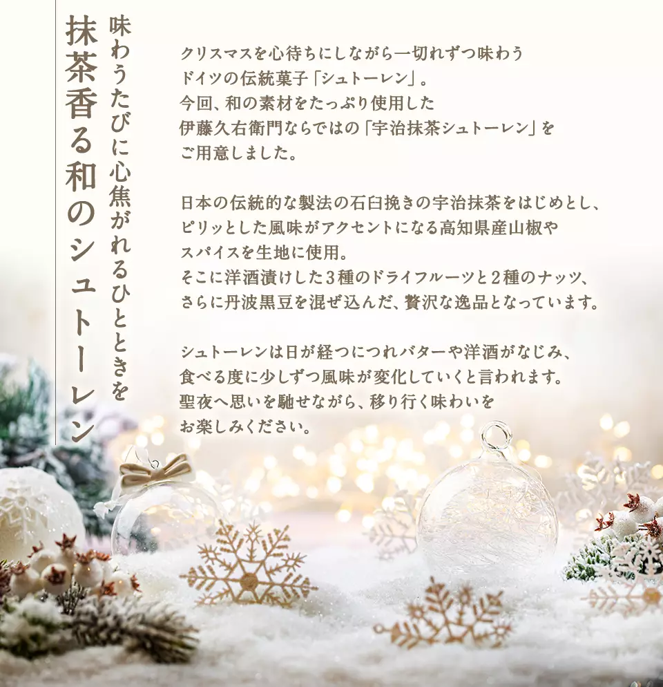 クリスマスを心待ちにしながら一切れずつ味わうドイツの伝統菓子「シュトーレン」。今回、和の素材をたっぷり使用した伊藤久右衛門ならではの「宇治抹茶シュトーレン」をご用意しました。