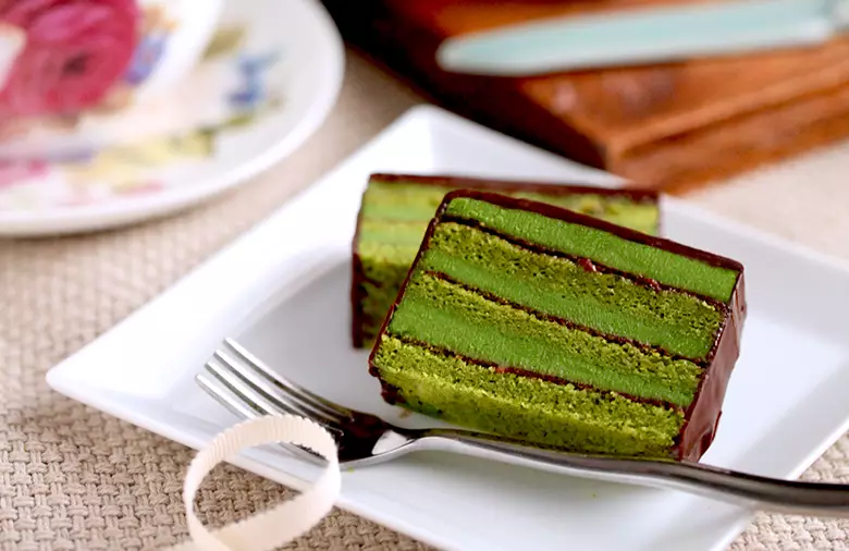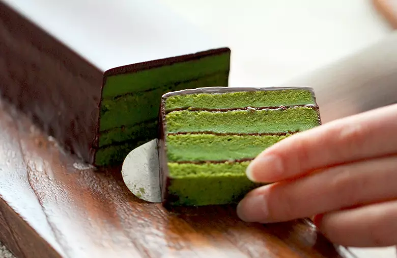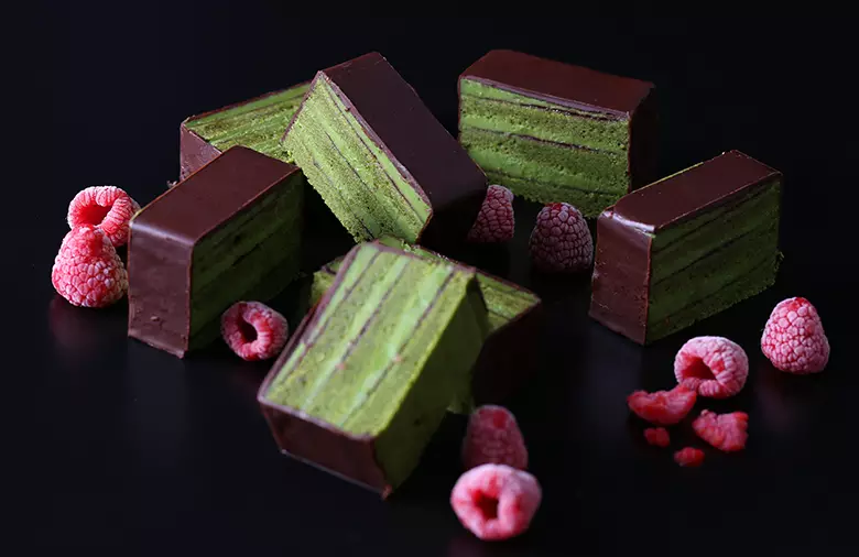 アーモンドパウダーを練りこんだ生地と抹茶のガナッシュを三層に重ね合わせました。