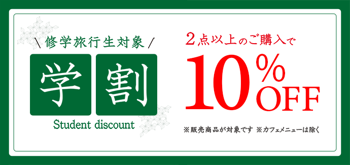 修学旅行生を対象に学割を実施しております。商品を2点以上購入で合計金額より10%OFFいたします。修学旅行のお土産、思い出にぜひ当店をご利用ください。