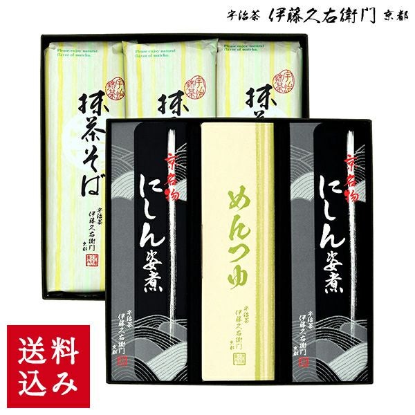 宇治抹茶そば2人前×3袋、めんつゆ6袋、にしん3本セットです。にしんは、秘伝のタレでしっかり味付けされているため、つゆに入れても美味しくお召し上がりいただけます。