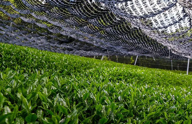 4月下旬から茶園上にある黒い寒冷紗(かんれいしゃ)で茶葉を覆って日光を遮断し、新茶の準備にかかります。これによりリラックス効果のあるテアニンが茶葉に蓄えられるのです。約20日間日覆いを続けた後、5月中旬から茶摘みがはじまります。