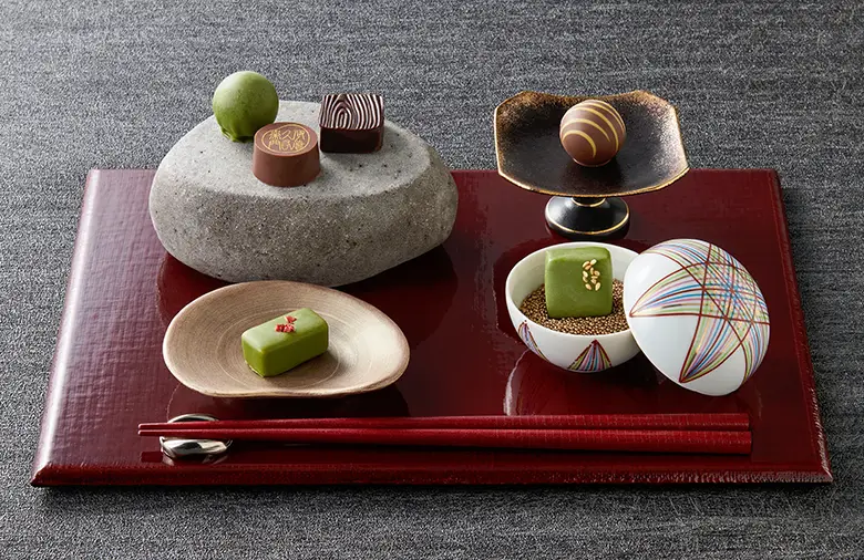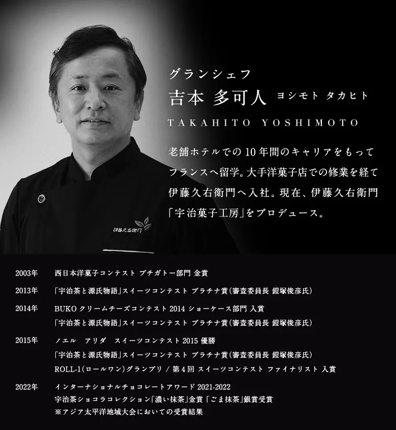 グランシェフ・吉本多可人が、連綿と続く伝統の宇治茶に新たな発想を加え、日本人の心に響く味わいを目指して作り出したショコラコレクション。