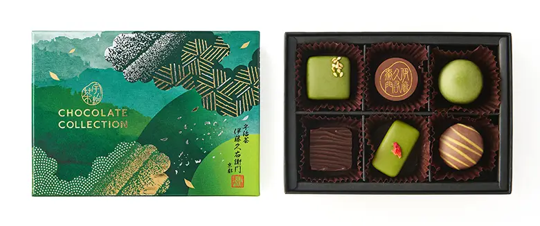 宇治茶を知り尽くした伊藤久右衛門グランシェフが練り上げたオリジナルレシピでお届けする、一粒一粒が主役のスペシャルなチョコレートたち。9種類の中から選ばれた6種のチョコレートは、見た目の美しさだけでなく食感や風味などすべてが異なるフレーバー。目で装いを楽しみ、舌で「宇治抹茶」「宇治ほうじ茶」の美味しさを愉しむ「ショコラコレクション」。本命チョコや自分へのご褒美に、贅沢な時間をお届けします。6種6個入。