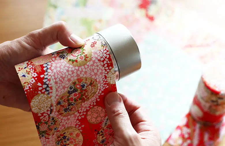そんな和情趣を感じる美しい和紙を、職人が心込めて一つ一つ大切に手作業で茶缶へと仕上げました。