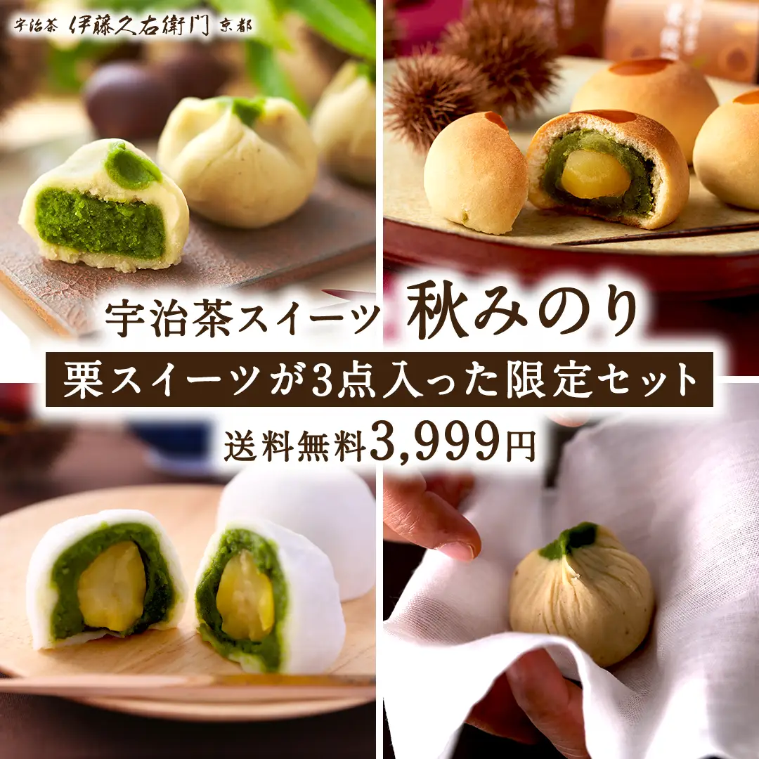 「お抹茶の生栗きんとん」「秋の宇治茶三色だいふく」「宇治抹茶栗饅頭」は、どれも栗の旨味と宇治抹茶の風味をご堪能いただける逸品ぞろいです。