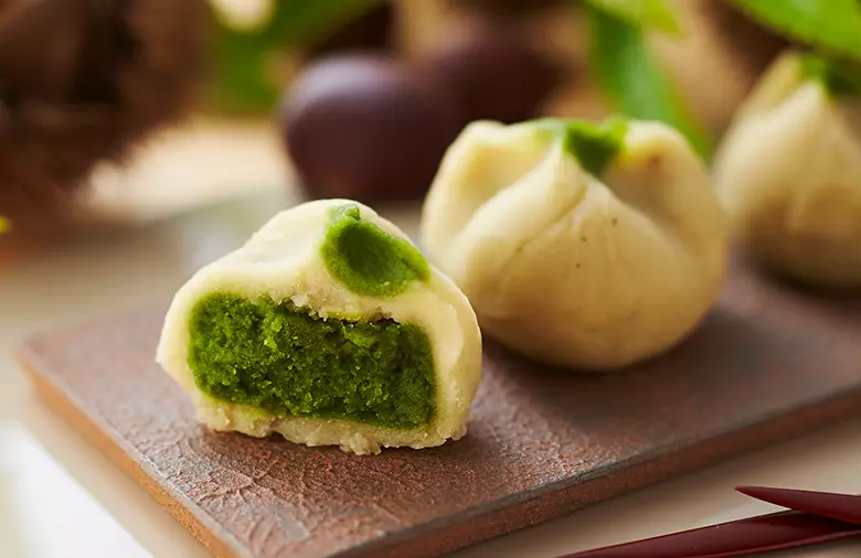 丹念に石臼で挽いた抹茶を使った口どけ滑らかな抹茶餡で、じっくり煮詰めた栗の甘露煮をそのまま丸ごと一粒包み込んでいます。