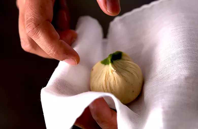 栗きんとんの中でも「茶巾絞り」と呼ばれるものは形が素朴でひときわ愛らしく、職人の技が光るひと品です。