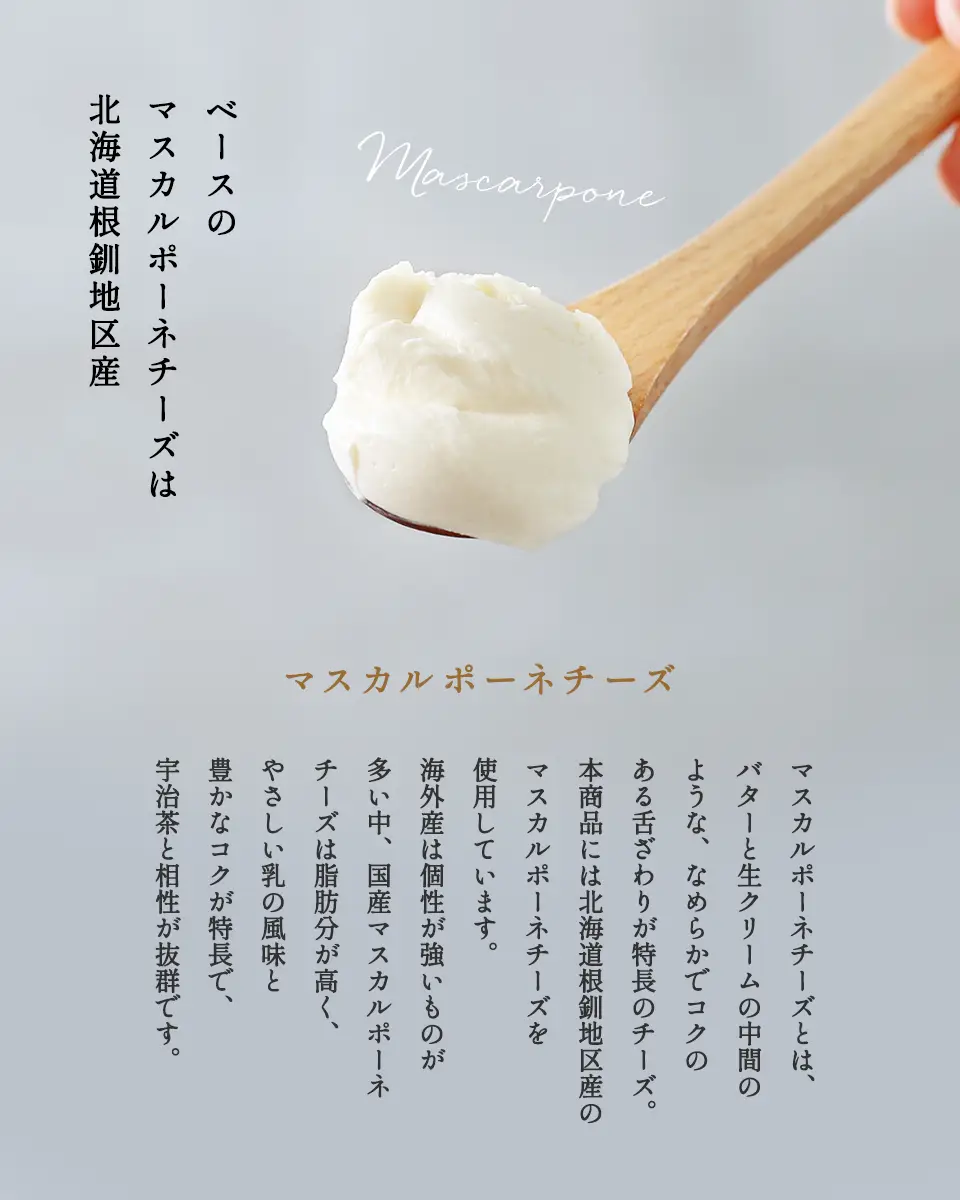 海外産は個性が強いものが多い中、国産のマスカルポーネチーズは脂肪分が高く、やさしい乳の風味と豊かなコクが特長で、宇治茶との相性が抜群です。