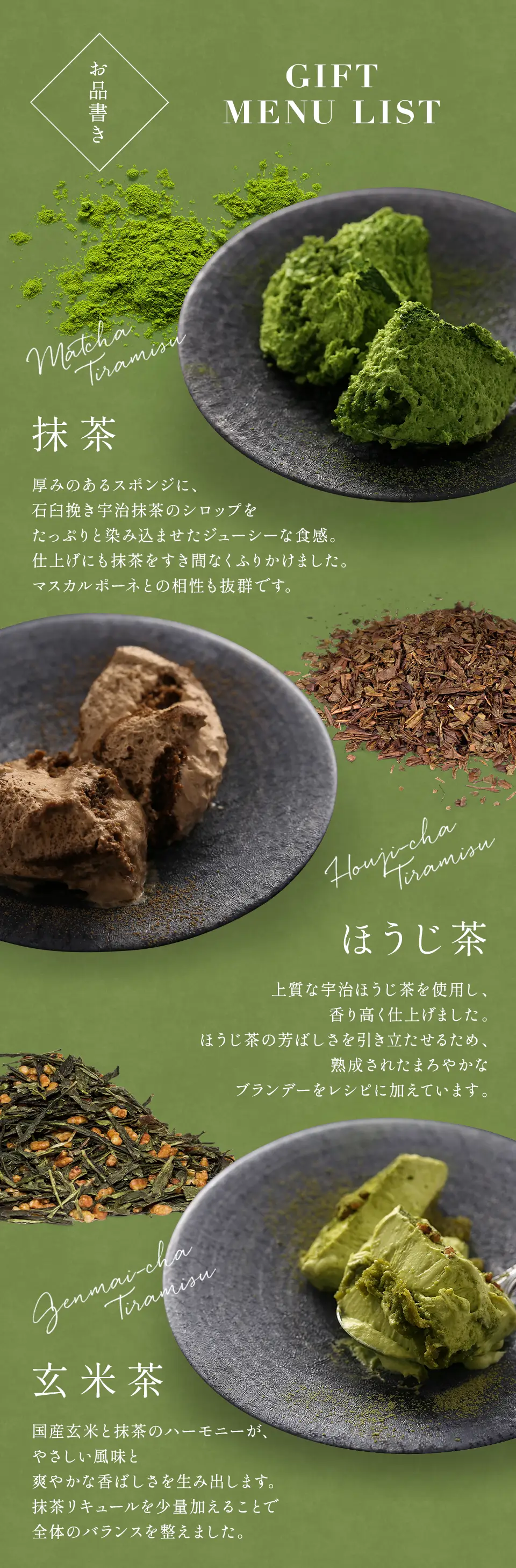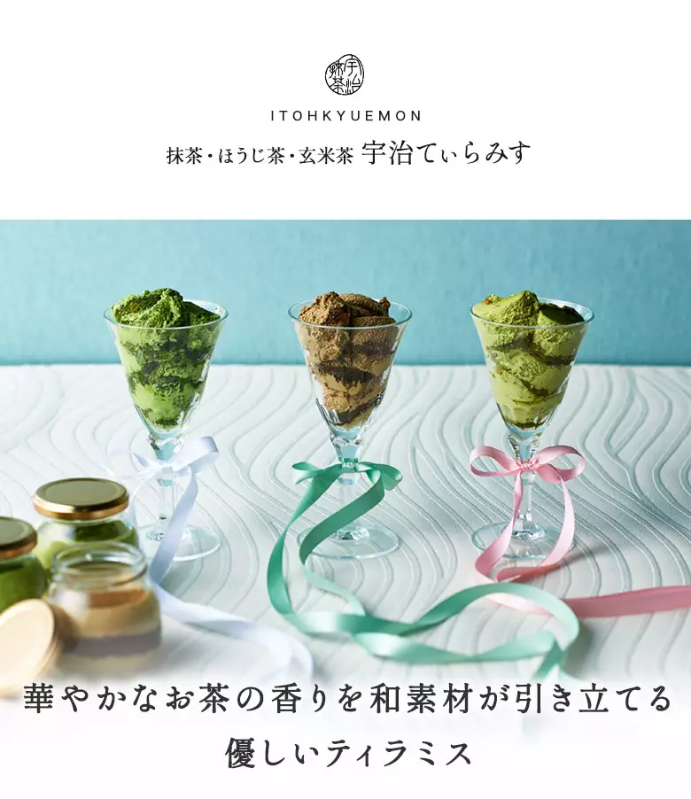 「私を元気にして」という意味をもつイタリアンドルチェ「ティラミス」を、3種の宇治茶の風味を活かして上品な味わいに仕上げました。