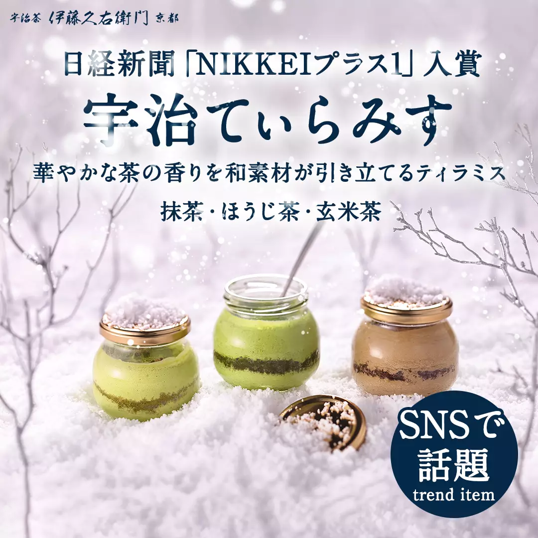日経新聞「NIKKEIプラス1」入賞の「宇治てぃらみす」、華やかな茶の香りを和素材が引き立てるティラミスです。北海道産マスカルポーネと宇治茶3種のハーモニーをお楽しみください。