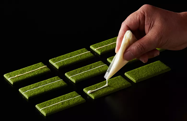 抹茶の色味は、人が好む自然なグリーンの色味だと思います。その色味を活かし、中のバタークリームは白く仕上げ、見た目からも思わず手に取りたくなるようなお菓子に仕上げました。