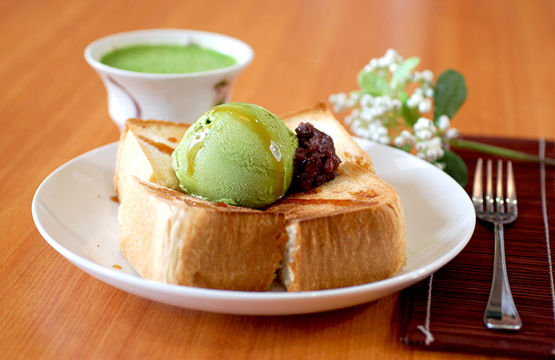 こんがり焼いた厚切りのトースト、甘いバターの匂いに溶け込む抹茶の香り、たっぷりの黒蜜のやさしい甘さ…。
