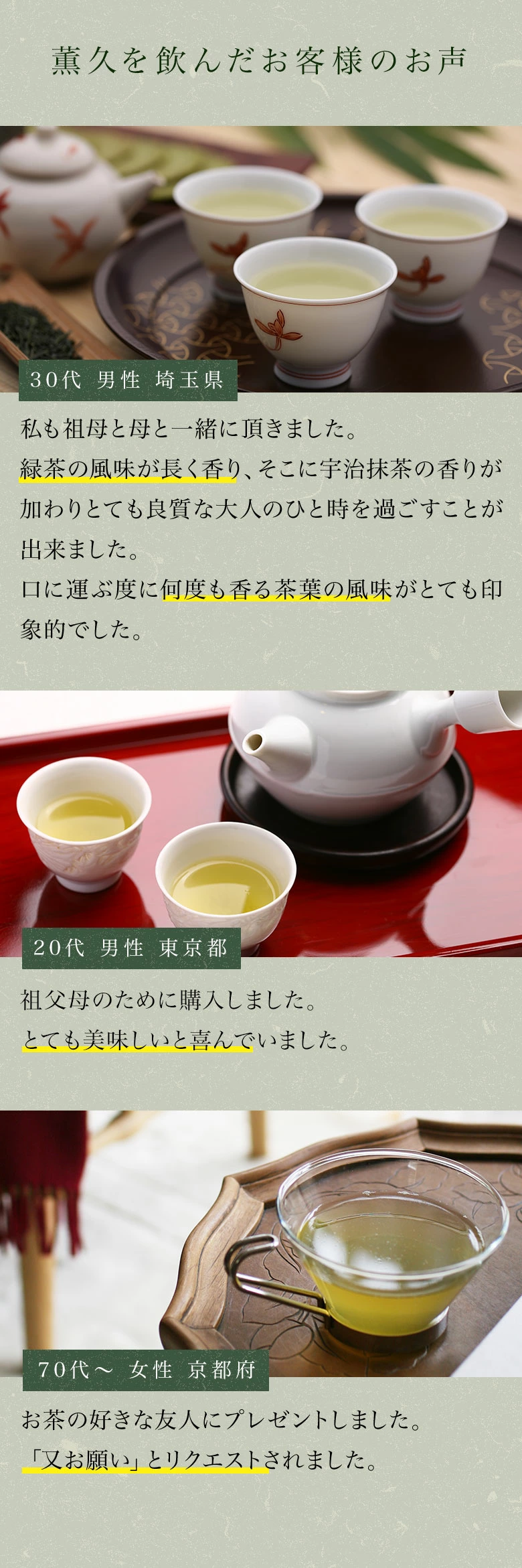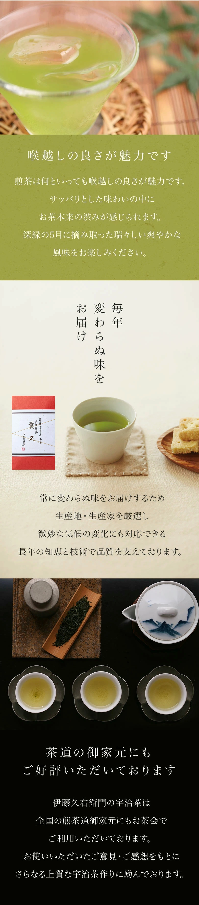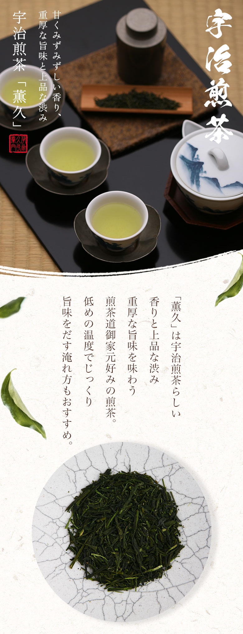 薫久(旧 : 清風)。香り高く、清涼感のある味わいです。煎茶道、各流のお茶会にもご利用いただいております。