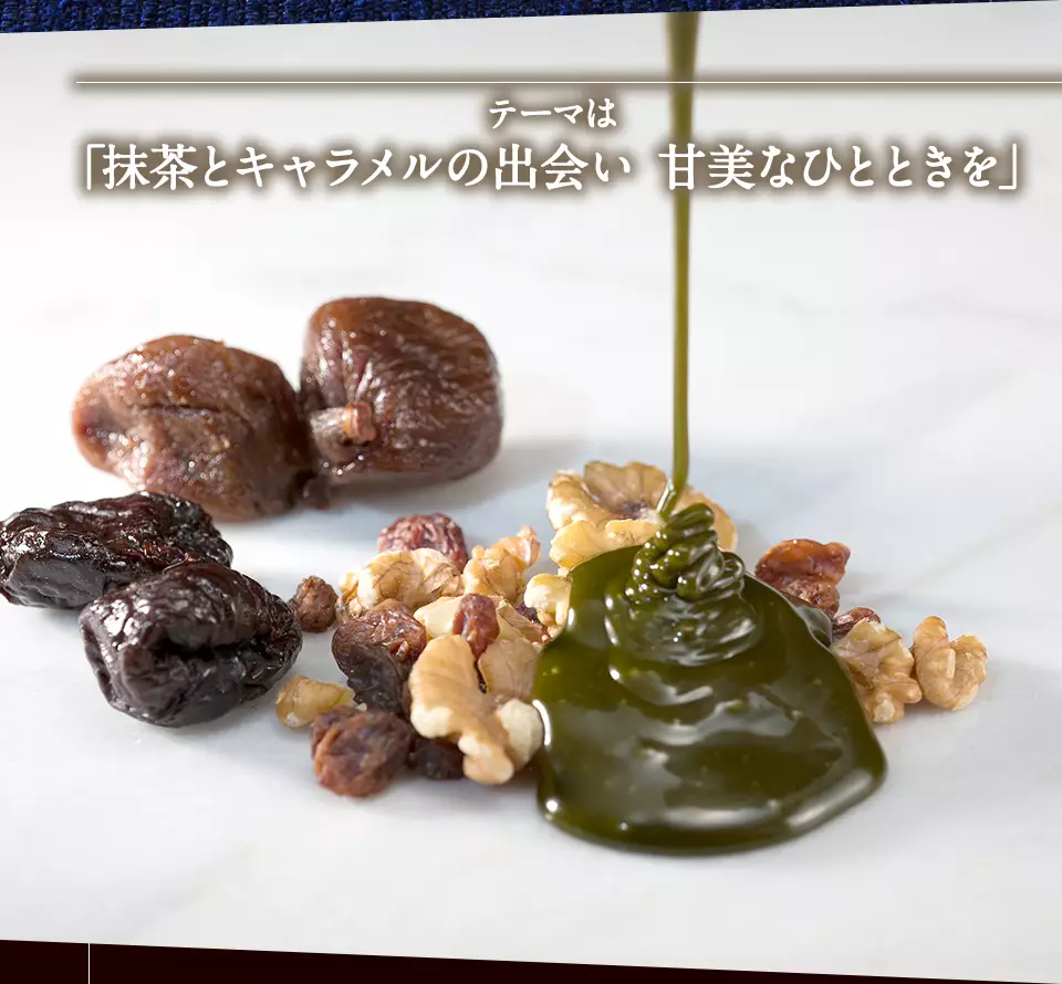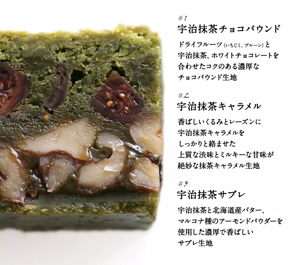 上品なほろ苦さの宇治抹茶をはじめ、香ばしいくるみ、ミルキーなキャラメル、複数のドライフルーツ等の多種多様な素材を、それぞれサブレ生地、チョコパウンド生地、キャラメル生地に贅沢に使用。