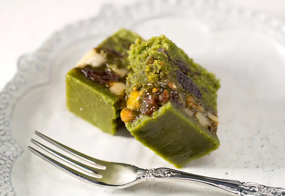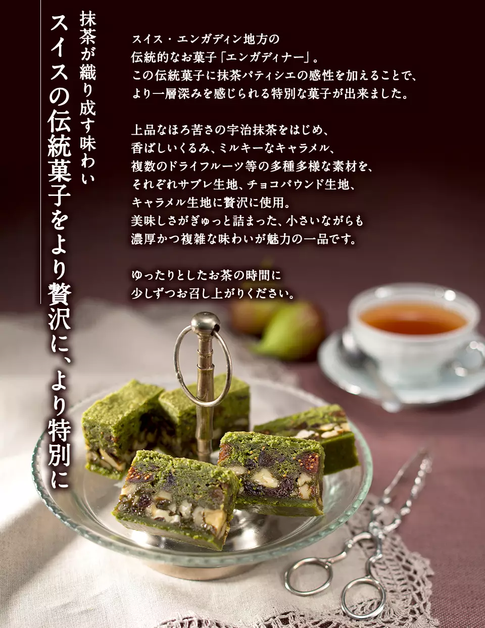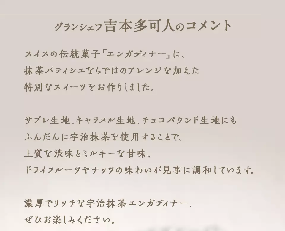 スイス・エンガディン地方の伝統的なお菓子「エンガディナー」。この伝統菓子に抹茶パティシエの感性を加えることで、より一層深みを感じられる特別な菓子が出来ました。