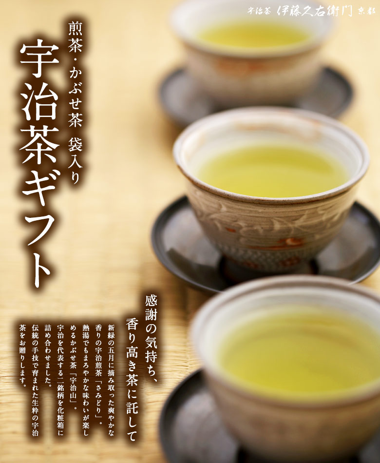 新緑の五月に摘み取った爽やかな香りの宇治煎茶「さみどり」。熱湯でもまろやかな味わいが楽しめるかぶせ茶「宇治山」。宇治を代表する二銘柄を化粧箱に詰め合わせました。伝統の手技で育まれた生粋の宇治茶をお贈りします。