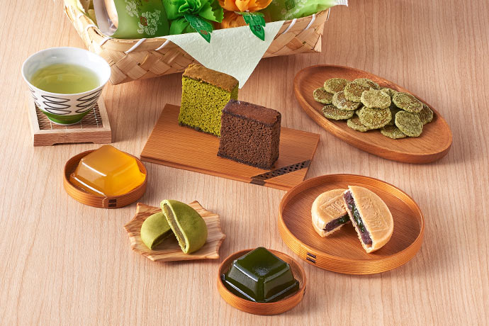 抹茶スイーツを含む7種の菓子を、竹かご一杯に詰め込みました。