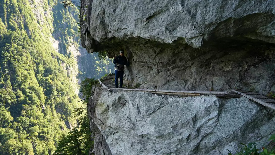 今年は下ノ廊下…黒部ダムから宇奈月温泉の欅平、トロッコ列車あたりです。関電の水力発電とかの開発時代、100年くらい前に作られた道で、こんな谷のところをそこを30数キロとかえぐって道が作られてるんです。下まで300mくらいあるんちゃうかな。